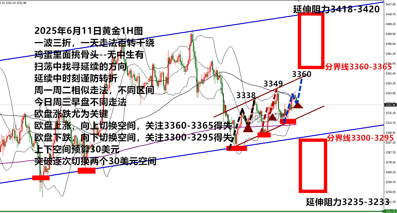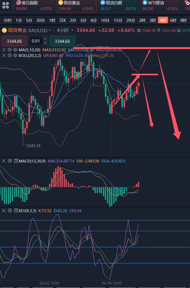 有些人总以为市场艰难,赚钱难,一问旁人都是亏钱,但其实并非这样,难是另外一回事,关键是你花多少精力进来学习,同一个市场,同一个梦想,投资不如意,心有不甘,只因自己不够强大,没有一本万利的生意和工作,各行各业都是如此,成功的人多吗?一群人也就那么几个。投资应有自己的思路,思维以及交易方式,别人的交易你没办法如法炮制,精髓在于你如何总结出自己的一套方式。 ————————消息面 周三(6月11日)现货黄金小幅反弹,目前交投于3345美元/盎司,当前黄金市场正处于多重因素的交织影响之下。地缘政治紧张局势和全球经济放缓为金价提供了坚实的底部支撑,但中美贸易谈判的乐观预期和美元走强则限制了其上行空间。