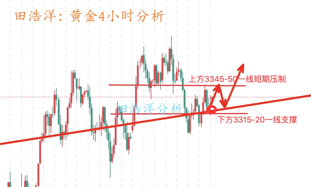 黄金周二早间最低触及到3302附近后探底回升,然后美盘最高触及到3348一线后压制回撤3315附近后再度上升,目前继续维持于3340附近位置震荡,昨日收于阴线的十字星形态,那么日内的走势较为关键,虽然短线内多头尝试性的突破,但终究还是没有突破,目前上方的重点压力则维持于3345-50一线,我们继续关注3345-50一线的得失,如果你目前黄金操作不理想,希望田浩洋能让你的投资少走弯路,欢迎前来沟通交流! 从4小时分析来看,下方支撑关注3315-20附近,回踩依托此位置继续先多看反弹上行延续,上方阻力关注3345-50附近,整体金价保持高空低多循环参与主基调不变。具体操作策略我会在盘