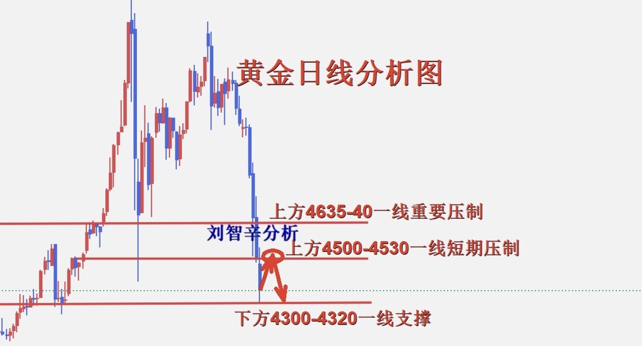 刘智辛:现货黄金晚间行情分析,探底反弹继续做空 随着美联储鹰派利刃高悬,黄金市场遭遇史诗级崩塌,多头节节败退,空头势如破竹,行情惊心动魄,扣人心弦。高利率周期大幅延长,美元与美债收益率联袂飙升,叠加资金疯狂出逃,金价连破关口,一泻千里。而早间低开于4472附近后开始反抽,最高触及到4537一线后一泻千里,市场情绪彻底崩溃,抄底资金销声匿迹。最低触及4097美元,日内跌幅超8.7%,几乎回吐2026年全部涨幅。也是创下1983年3月以来最大单日跌幅,空头势不可挡。而目前日线连续收出巨阴线破位,大幅下挫,小时线布林带大幅开口向下,金价沿下轨弱势运行,承压于短期均线下方运行,短期反弹力度杯水车薪。