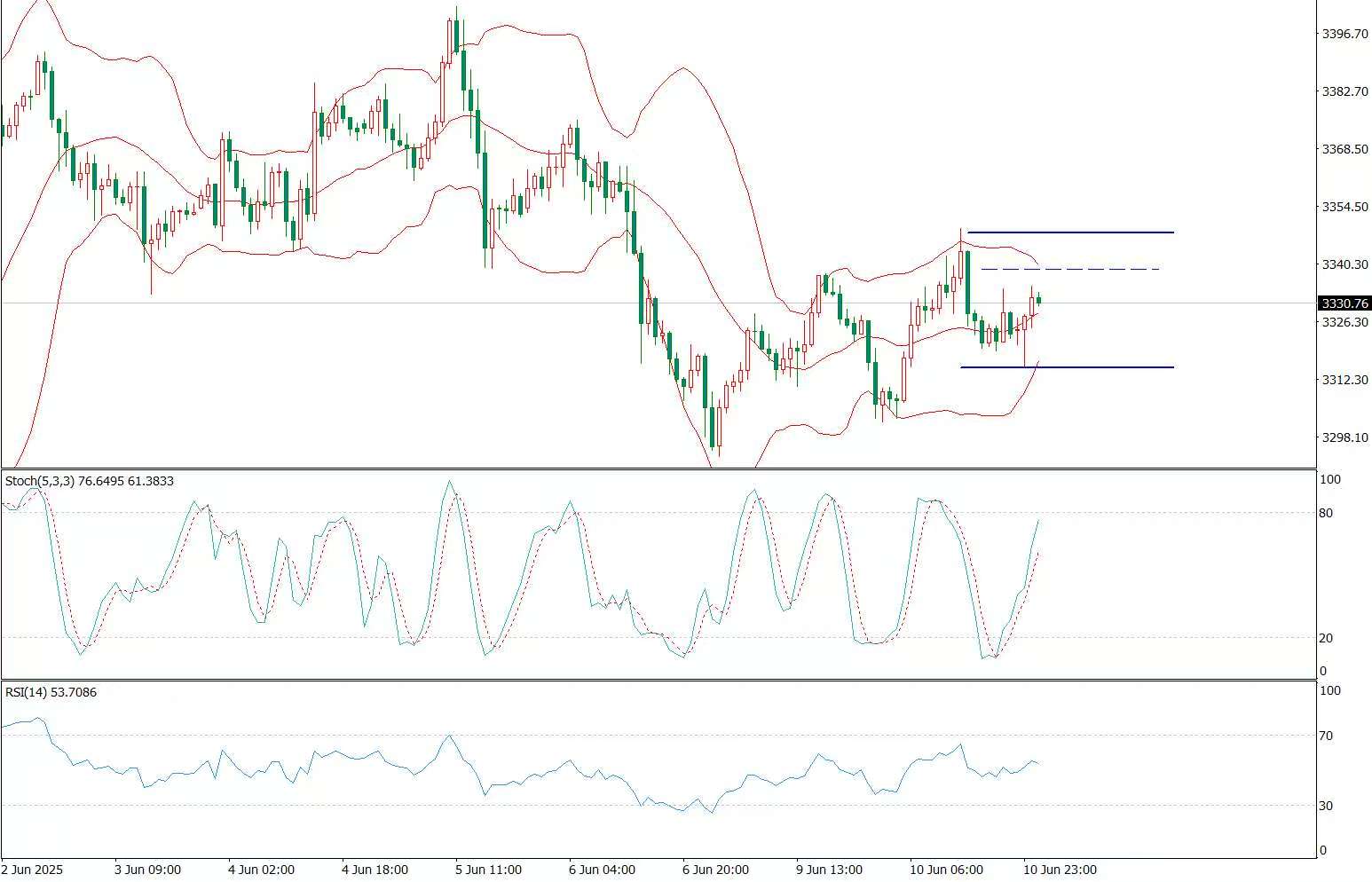 周二(6月10日),现货黄金盘中自3300附近反弹,美盘金价反弹延续涨至3348附近回落。 消息面解读:市场当前处于高度警觉状态,技术图形与基本面形成交错影响。一方面,交易员对未来美联储降息路径仍保有希望,使得逢低买盘力量尚存;另一方面,非农数据的强劲表现又使部分资金转为观望,等待周三CPI及周四PPI两项关键通胀数据,以研判美联储政策动向。此外,风险资产表现稳健,限制了避险资金大幅流入黄金,风险偏好与避险交织,使得黄金短期内缺乏明确趋势性动能。总体而言,黄金处于典型“盘整市场”,交易员关注是否通过消息面触发方向选择。 黄金走势分析:周一黄金日线窄幅十字K线收平,短线下破3300一线后又收回