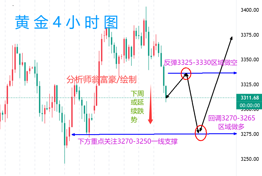 上周五回调修正,本周初开盘则是延续测试低位支撑,实在没想到空头反而还发出强力一击!击破我们的关键支撑3330一线!虽然不至于改变多头的形式,但是后面的力度就有些弱了。 今天白盘若延续跌幅,只能找机会低位做多了!而当前行情依旧弱势,本周一的布局又该如何呢?下面兴言来给大家进行解析! 利空?利多?黄金走势受制于什么因素? 其一就是周五非农公布之后,市场对降息预期大幅降温,美元指数反弹压制以美元计价的黄金。其二就是地缘风险与贸易局势缓和,削弱黄金作为避险资产的吸引力。加上当前央行购金暂停,削弱了当前市场的长期信心! 对于今天黄金走势的看法! 早间的这一波发力,金价直接跌到了3298美元。对于目前的