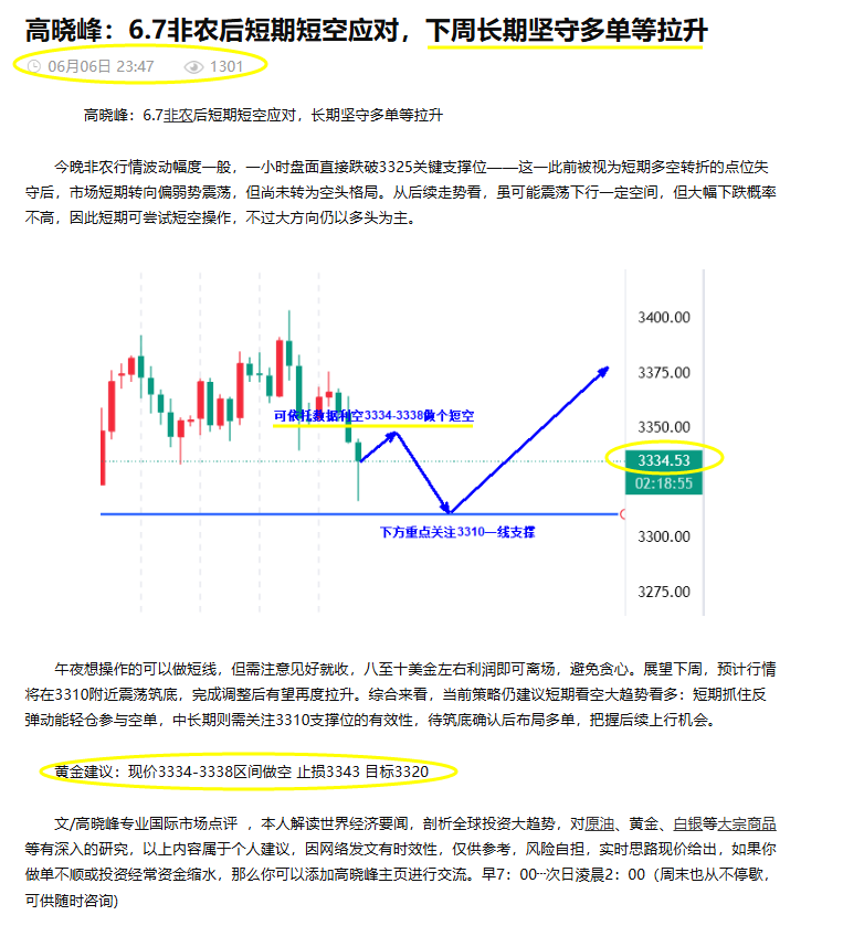 高晓峰:6.7非农数据波动是风险更是机会,二单完美止盈 从昨晚非农数据表现看,本次非农结果介于前值与市场预期之间,理论上应触发先跌后涨的修正走势——即数据公布瞬间因略低于预期引发短暂抛售,随后因利空出尽推动趋势走弱。但结合本周实际行情观察,当前市场缺乏关键消息面或数据端的额外助力,金价始终难以突破单边上涨动能。多空博弈下,短期趋势更偏向震荡整理,而非强势上行。基于此,下周操作需警惕多头乏力风险,建议以高空思路为主,关注上方阻力位的突破情况,若无法有效站稳关键位置,可择机布局空单。 文/高晓峰专业国际市场点评 ,本人解读世界经济要闻,剖析全球投资大趋势,对原油、黄金、白银等大宗商品等有深入的