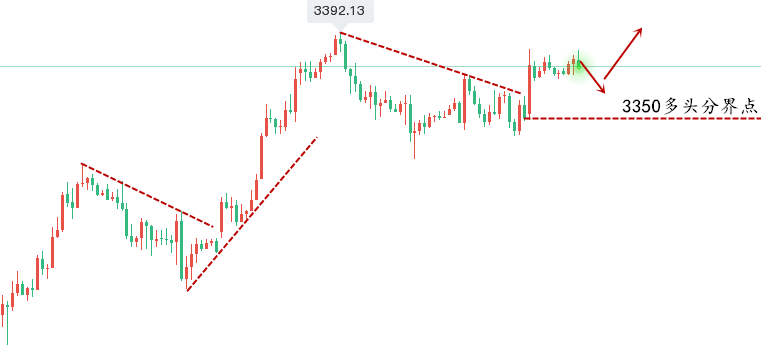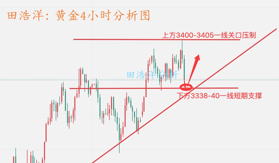 黄金本周我们收获颇丰,一路看涨,一直回踩做多,相信关注我的朋友都可以看到本人一直看多,多头全部完美达到目标,今天我们给了几次做多,目标3395-3400一线也是完美到达,美盘后触及最高3403一线回踩,我们也继续在3363-65一线多单3373一线获利出局,目前黄金最低回踩3340一线,我们也给了3340-45一线不破可以多,如果有进场的朋友现在3350一线可以获利出局,只要下方重要支撑不破,那么趋势就不会改变,如果你目前黄金操作不理想,希望田浩洋能让你的投资少走弯路,欢迎前来沟通交流! 从4小时分析来看,午夜下方短期支撑关注3338-40一线附近,午夜企稳此位置上方继续看多头强势震荡上行节