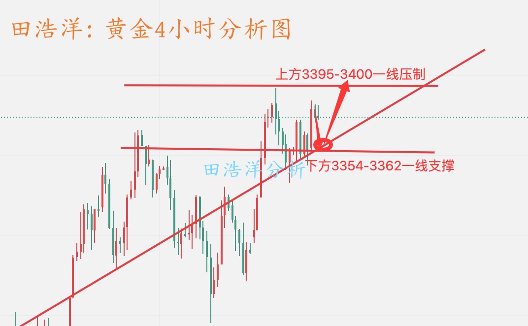 黄金昨天周三完美突破短区间压制,午夜最高触及3384一线然后震荡,昨天白天我们多次下方给出多单,趋势也是比较明朗看多,午夜触及上方3384一线震荡下行我们也在3380附近介入了短空,空单也是获利近十美元在3370附近离场,今天总体趋势来看和昨天一样,依旧是看多不变,短期我们先关注今天的支撑3355-62一线,回踩依旧是可以找机会介入多单的,如果你目前黄金操作不理想,希望田浩洋能让你的投资少走弯路,欢迎前来沟通交流! 从4小时分析来看,下方支撑关注3354-62一线附近,日线级别企稳此位置上方继续看多头强势震荡上行节奏,重点关注3340-45一线支撑,上方关注3395-3400一线压制,日内围