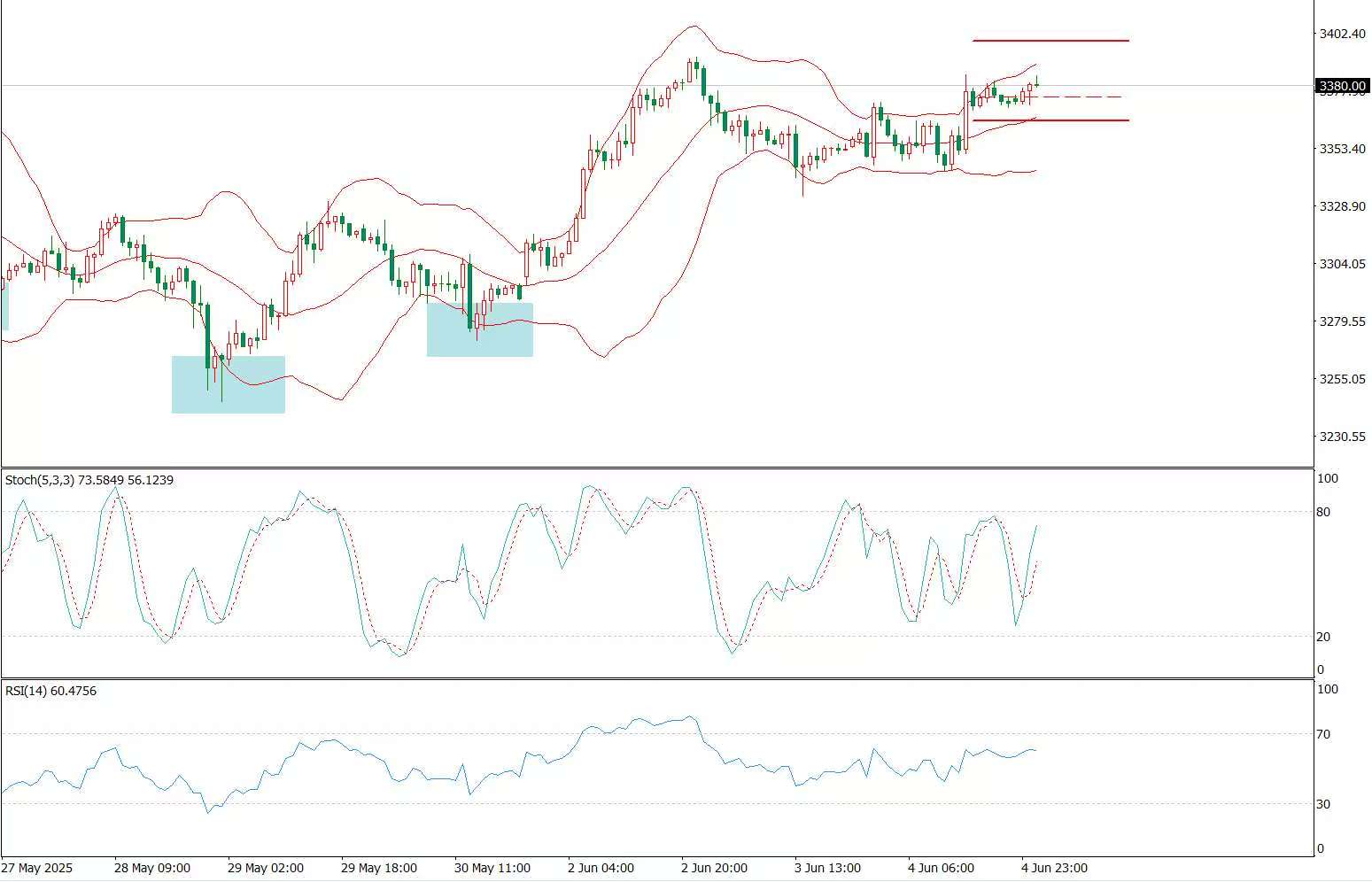 周三(6月4日),现货黄金多头重启,日内整体偏震荡,美盘自3350走涨到3385附近滞涨回落。 消息面解读:周三(6月4日),美国5月ADP就业报告如期于北京时间20:15发布,数据远低于市场预期,引发市场剧烈反应。根据ADP全国就业报告,5月美国私营部门仅新增3.7万个就业岗位,远低于市场预期的11万个,创下自2023年3月以来最低增幅。对比4月下修后的6万个新增岗位,劳动力市场放缓趋势进一步显现。这份被称为“小非农”的数据虽不直接等同于周五即将公布的劳工统计局非农就业报告,但其作为领先指标,点燃了市场对经济前景和美联储货币政策的热议。 黄金走势分析:从技术角度来看,隔夜突破3324-33