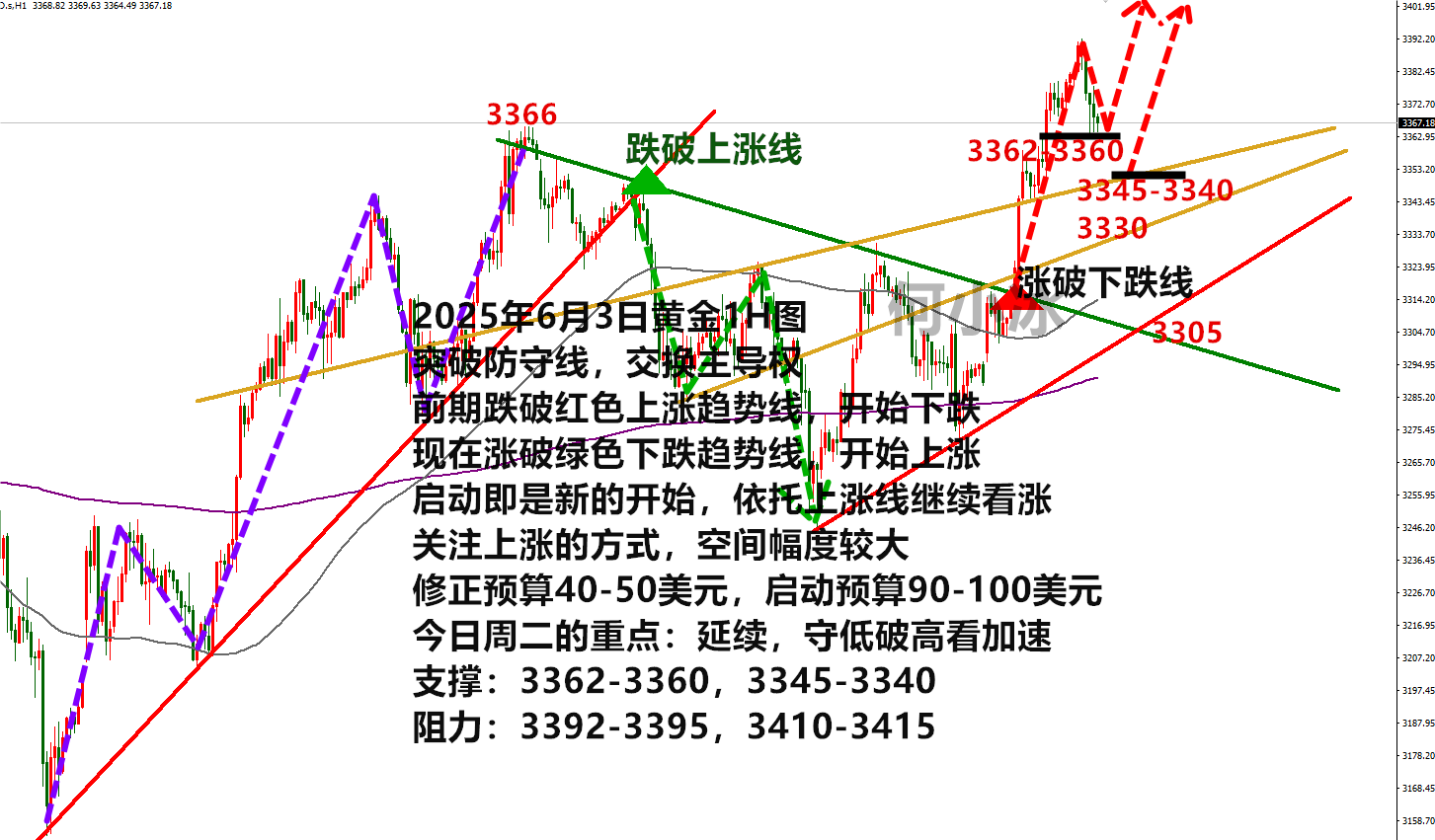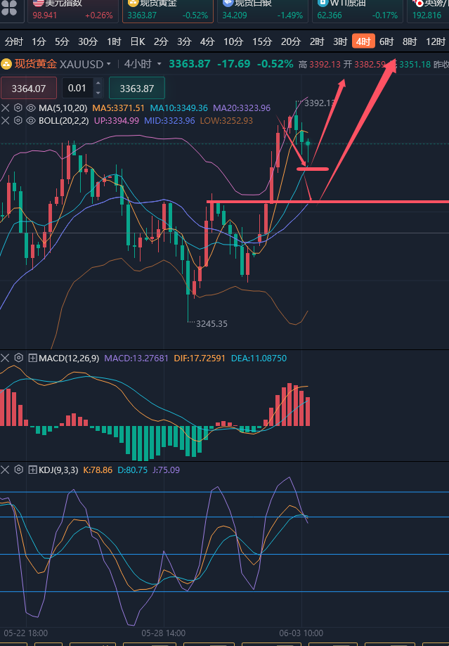 投资市场永远有四个层次:保住本金,控制风险,赚取收益,长期稳定持续赢利。不要因为一天的输赢定结果,赚钱是偶然还是必然,是凭真功夫还是凭运气,在市场上能活着的肯定是最终能够长期持续赢利的投资者。交易就是一个好的习惯,严格执行你的交易计划。一次严谨的交易=良好的心态控制+正确的仓位控制+过硬的技术功力。 ————————消息面 今日周二(6月3日)现货黄金在惊人暴涨后震荡下跌,目前金价位于3363美元附近,主要受到美元自六周低点的温和反弹和风险情绪回升的影响。受隔夜风险资产上涨影响,削弱了避险需求,令部分黄金多头选择获利了结。不过,市场对全球形势依旧保持警惕。美国财政赤字持续扩大、亚洲大国与美国