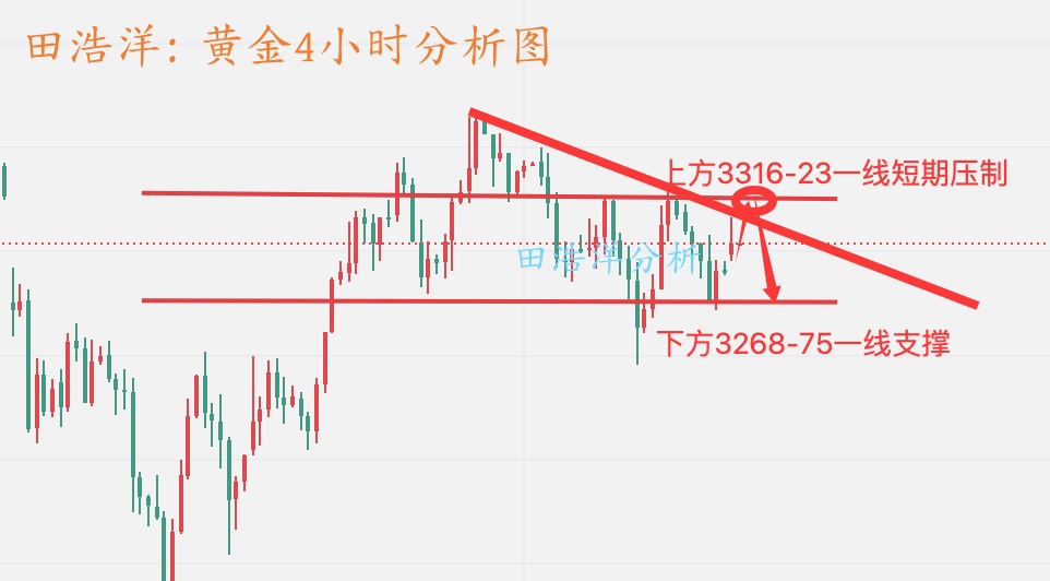 黄金今天周一开盘高开在3298一线,最低回踩3295一线开启反弹,截止目前上方最高触及3316一线震荡回踩,目前在3306一线震荡,周末我们分析上方关注3316-21一线压制,反弹不破可以空,直接目前已经验证了,今天是端午节假最后一天,如果你对操作束手无策,可以前来沟通交流,如果你目前黄金操作不理想,希望田浩洋能让你的投资少走弯路,欢迎前来沟通交流! 从4小时分析来看,上方阻力短期关注关注3316-21一线压制,下方关注3268-75一线短期支撑,保持顺势参与主基调不变。具体操作策略我会在盘中提示,及时关注。 黄金操作策略: 1、黄金反弹3316-3321一线不破做空,止损3329,目标32