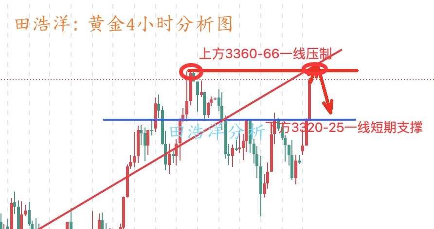 黄金周末美国加关税影响黄金今天开盘高开3298一线,随后触及最低3295一线开启反弹,截止目前黄金最高触及3359一线震荡,下午在3320附近我们通知了做空,很遗憾止损了,因为3316-21一线是上周的短期压制点,也是下跌的突破点,这里轻仓做空止损也是事出有因,希望大家理解,目前黄金上方我们先关注前期高点3360-66一线,反弹不破我们再介入空单,虽然黄金目前处于高位震荡,但是我们前往不要追多,如果上方压制得不到突破,那么,技术面将会有所回调,如果你对操作束手无策,可以前来沟通交流,如果你目前黄金操作不理想,希望田浩洋能让你的投资少走弯路,欢迎前来沟通交流! 从4小时分析来看,上方阻力关注3