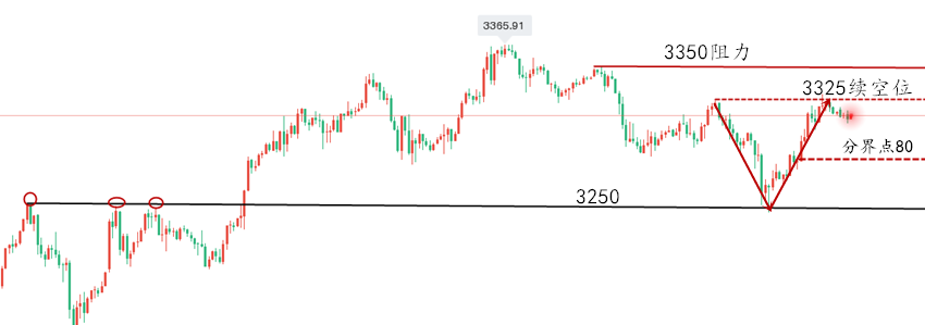 人无远虑,必有近忧,对待行情也同样如此,行情的涨跌不是靠个人主观意志所决定的,而是充斥着多于空的搏杀,所以,选择远远大于努力,择良师,将会获益匪浅, 如果你还在盲目的交易,天天除了套单就是锁单,那么兴言想说你很失败,路走偏了却不愿意换一条路,只能证明你伤的还不够深!话不多说,行情未动,策略先行,日内分析即将给出! 对于今天黄金走势的看法! 目前来看,黄金迎来周线的最后一天,本周昨日最低点在3245一线,也是前期顶底转换的位置,昨日下跌反抽走了一个V形反转,而昨晚承压下跌口在3325附近位置并没有突破,只有突破才有继续测试3350强压的一个机会,加上当前还是一个偏向震荡的走势,而今天要是跌破3