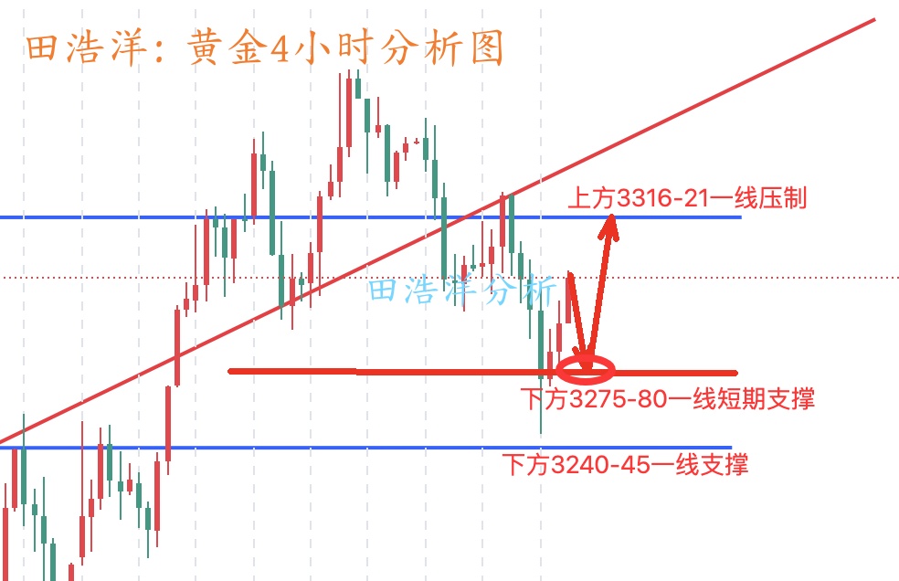 黄金再次重复了之前的故事,再次进行了触底反弹,今天上午最低触及3245一线反弹,目前已经冲击3300一线附近,多头再次入我们预期反弹,晚间我们先不要追多,上方先关注3308-10一线短期压制,重点关注3316-21一线压制情况,如果不破上方压制我们暂时不要追多,重点我们关注晚间初请失业金数据公布,保持高空低多主基调进行参与,如果你目前黄金操作不理想,希望田浩洋能让你的投资少走弯路,欢迎前来沟通交流! 从4小时分析来看,上方短期阻力关注3308-10一线附近,重点关注3316-21一线压制,下方关注3240-45一线支撑,保持顺势参与主基调不变。具体操作策略我会在盘中提示,及时关注。 黄金操作