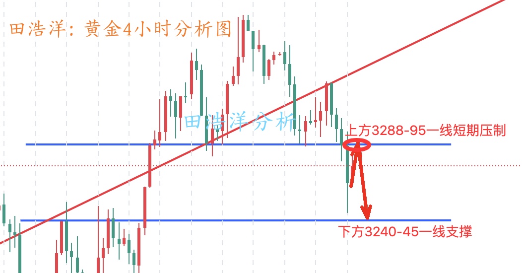 昨日黄金技术面先扬后抑,亚欧盘价格依托3292关口反弹上行,午后欧盘加速冲高刺破3320关口到达3325附近承压回落走跌,晚间美盘接连回落击穿3300整数关口并延续下行至3280附近弱势收盘,日K线报收压制回落中阴,今日亚盘开盘金价在度回落击穿3260关口陷入极弱单边空头形态中,短期金价反弹正式告一段落,目前再度回归到极弱单边下行通道中,我们继续保持关注下方支撑部分,尽量不要追空,保持高空低多主基调进行参与,如果你目前黄金操作不理想,希望田浩洋能让你的投资少走弯路,欢迎前来沟通交流! 从4小时分析来看,今日上方阻力关注3288-95一线附近,短期空头弱势分界线3300-10关口,下方短期关注