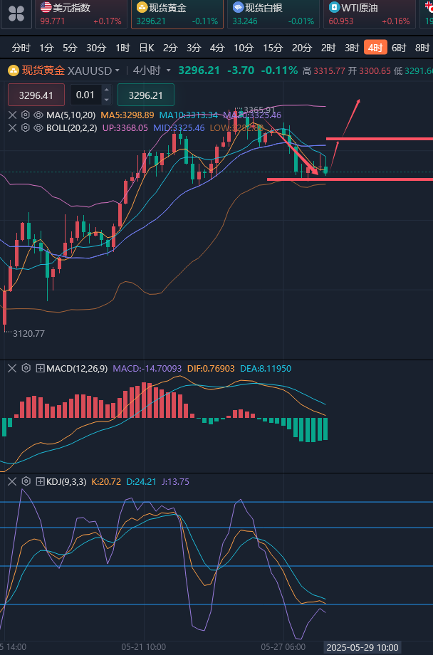 市场的波动永不停息,不用担心没有挽回损失的机会,交易市场的钱永远挣不完。如果此时一意孤行,为了弥补亏损而不肯罢手,很可能招致更大的损失。因为此时你操作的态度已乱,失去了冷静观察市场的能力。正所谓当局者迷,旁观者清,退步抽身,重新审视市场的变化,才是在此获得判断市场行情走势能力的上上选择。 ————————消息面 周三(5月28日)现货黄金震荡微跌,目前交投于3298美元/盎司附近。金价周二一度回落至3300关口下方,最低触及3285美元附近,但仍收盘在3300关口附近。俄乌冲突正在急剧升级,俄军不仅发动了大规模空袭,更在东北战线取得突破性进展——最新战报显示,苏梅地区四个村庄已落入俄军控制。