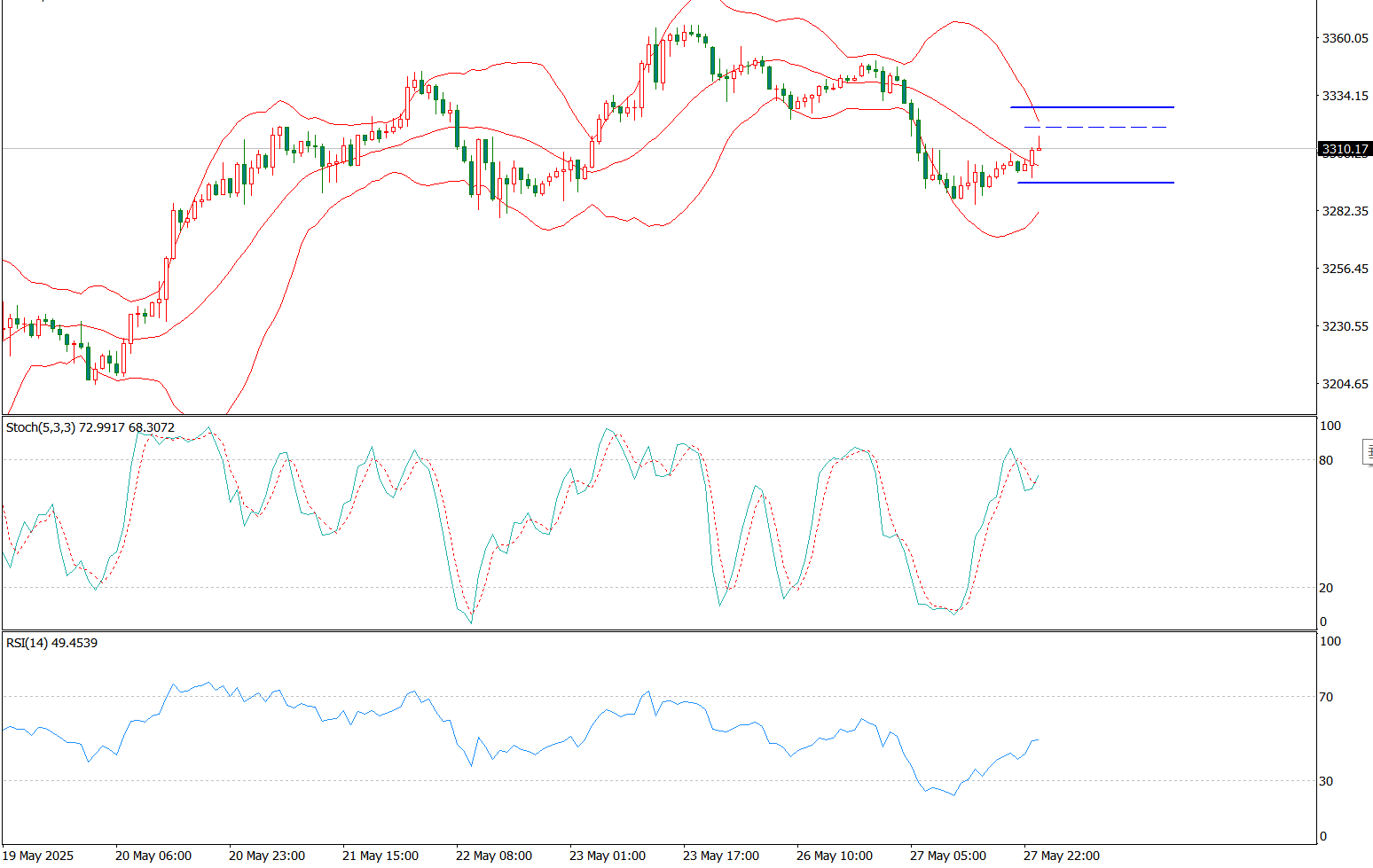 本周金融市场将迎来一系列重要经济数据,包括GDP修正值及PCE物价指数,后者将为通胀形势提供关键指引。美联储FOMC会议纪要将率先于今晚公布,随后周四将发布最新初请失业金人数数据,而本周收官之日则将由个人消费支出(PCE)价格指数和密歇根大学消费者信心最终报告共同主导。在地缘政治风险升温及美元走弱的背景下,黄金作为避险资产的配置价值随不确定性上升而增强。 4小时图显示,黄金上行力度强劲,在触及上方阻力位后受阻回落,当前价格处于布林带中下轨区域运行,布林带整体形态保持平稳,尚未出现明显开口迹象;小时图方面,黄金经历下跌后进入震荡整理阶段,布林带呈现收口收敛形态。翁富豪建议一旦黄金反弹3325-