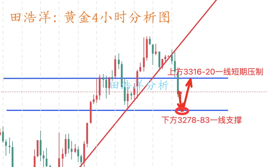 黄金今天开盘回踩后继续冲刺,我们也顺势在3330-33一线介入多单,多单在3340一线获利出局,黄金最高触及3350一线后开启震荡回落,截止目前黄金最低触及3287一线反弹至3300一线震荡,黄金我们晚间关注3278-83一线支撑,回踩不破我们依旧可以进行短多,毕竟技术面对白天下跌进行调整修复,操作上我们先回踩不破断线多,如果你目前黄金操作不理想,希望田浩洋能让你的投资少走弯路,欢迎前来沟通交流! 从4小时行情分析来看,上方短期关注3316-20一线压制,下方关注3278-83一线支撑,暂时依托此区间保持高空低多参与主基调不变,中间位置一律多看少动谨慎追单,耐心等待关键点位进场。具体操作策略