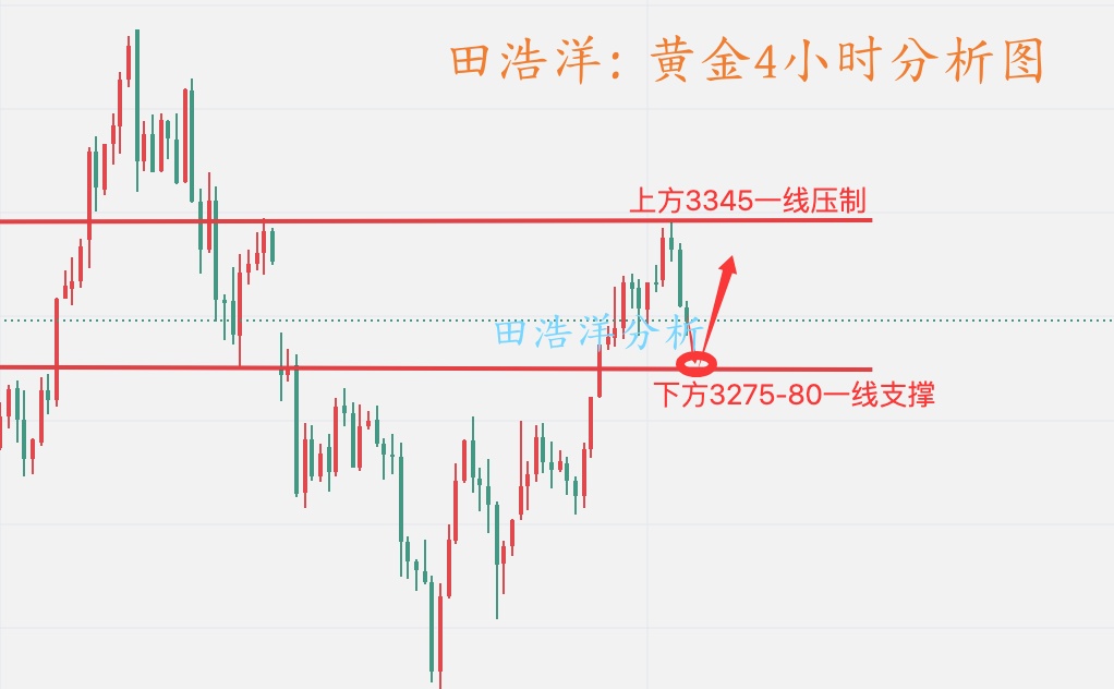 周五行情一路震荡上行,开盘在3295一线,最低触及3287一线触底反弹,截止目前最高触及3334一线后于3330一线震荡,近期行情涨跌幅度比较大,而且完全都在我们预期范围内,昨天我门周四上午我们给了3340-45一线做空,实盘在3341一线直接空,下午3380-85一线做多,晚上3390-93一线直接做多,多单目标3300-06一线,从目前走势来看,黄金可能还有高点,日内3334一线突破是迟早的事,操作趋势上来看,我们继续以回踩做多为主,如果你目前黄金操作不理想,希望田浩洋能让你的投资少走弯路,欢迎前来沟通交流! 从4小时行情分析来看,上方重点关注昨日高位压制3345一线,下方支撑关注328