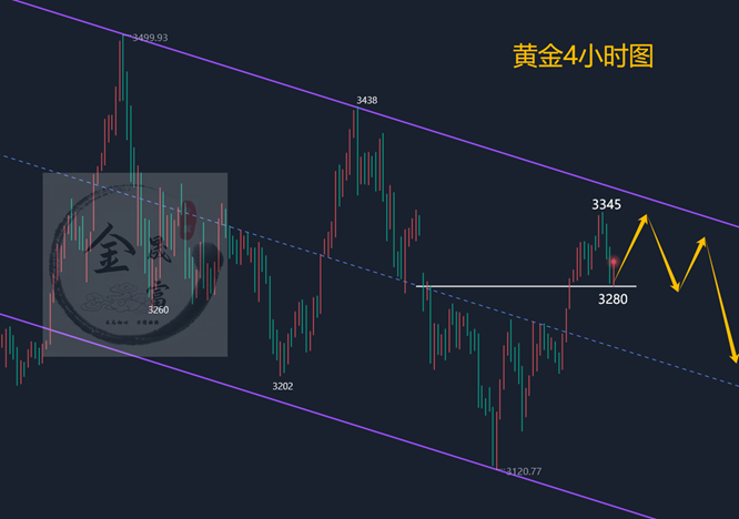 昨日黄金技术面在先扬后抑,亚盘在进一步加速冲高刺破3345关口后承压回落迅速走跌,我们也是成功在3341一线做空了,目标成功到达3310-15一线,午后欧盘延续下行击穿3300关口并延续下行至3280附近企稳反抽,我们在3280-85一线做多,目标3300-3306一线获利出局,晚间美盘二次冲高承压3315一线在度迎来压制回落调整,我们也是在3290一线多,成功3300-3306获利出局,日K线报收冲高回落震荡中阴,整体金价在3345关口短线出现压制震荡调整,昨日盘中三单也如期到达目标位,如果你目前黄金操作不理想,希望田浩洋能让你的投资少走弯路,欢迎前来沟通交流! 从4小时行情分析来看,今日
