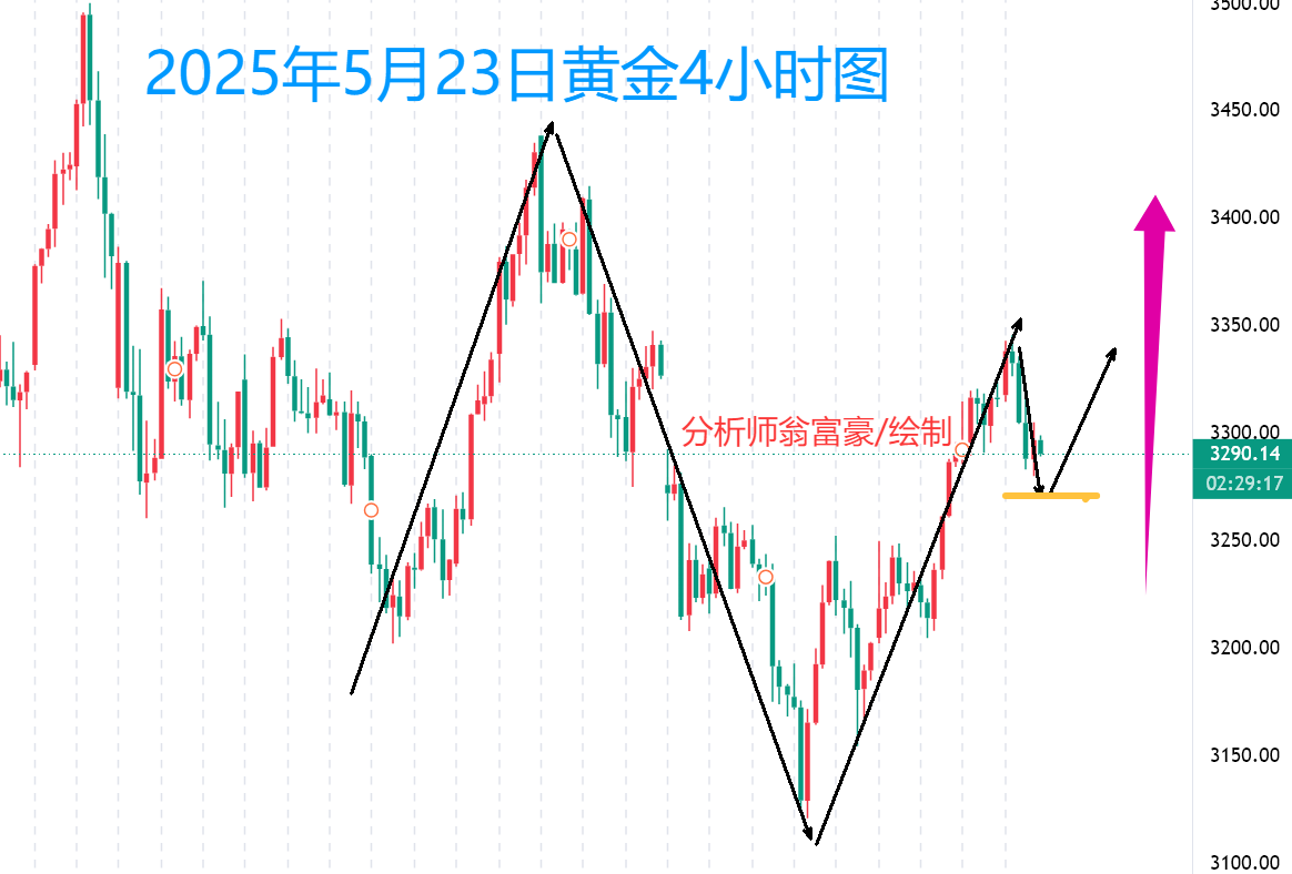 周四(5月22日),现货黄金在触及近两周高点3345美元后出现技术性回调,当前美盘时段围绕3290美元一线震荡整理。尽管美元指数温和反弹对金价构成一定压力,但市场对美联储降息预期的升温,以及美国财政赤字持续恶化的担忧,仍为黄金提供了关键支撑。当前黄金市场主要受三大因素支撑:美元疲软、地缘政治风险及经济不确定性,这些因素短期内难以消除。其中美国财政赤字货币化的长期趋势,叠加中东局势潜在恶化风险,可能继续推动金价上行。不过若美国经济数据意外向好或地缘政治局势出现缓和迹象,短期内可能抑制金价涨势,翁老师提醒大家需保持警惕。 黄金4小时图来看,昨日金价延续收阳,实现三连涨。短期来看,当前涨势大概率将
