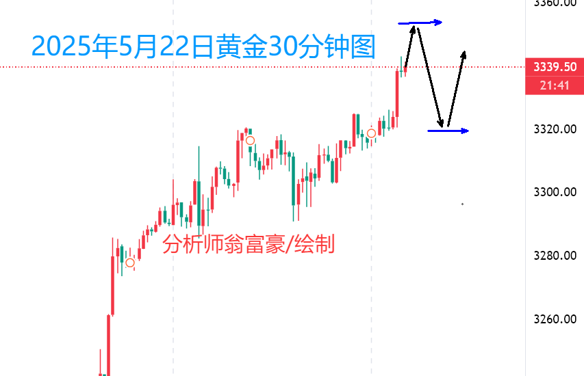 国际金价近期表现强劲,周三连续第三个交易日上涨,刷新一周高点至3324美元,最终收于3315美元,单日涨幅约0.78%。周四亚洲时段,现货黄金维持高位震荡,交投于3320美元附近。此轮涨势主要受两大因素驱动:一是美元指数持续走弱,二是全球地缘政治不确定性加剧,进一步凸显黄金作为传统避险资产的配置价值。本交易日翁富豪提醒需重点关注欧美国家5月份PMI数据、美国初请失业金人数变动及4月成屋销售年化总数等经济指标。此外国际贸易局势、地缘政治动态、G7会议相关消息,以及美联储官员讲话也将对市场走势产生重要影响,建议大家密切跟踪。 今日开盘后黄金延续涨势,黄金30分钟K线显示上升趋势明确,连续收出大阳