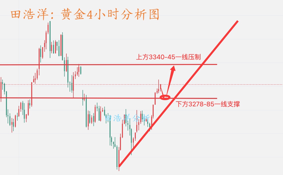 黄金昨日亚盘小幅冲高刺破3314关口迅速回落,快速向下回踩企稳3285关口企稳回升进一步震荡上行走高,午后欧盘加速冲高突破3314关口并延续拉升至3320附近承压回落陷入震荡反复,周三白天围绕3285-3321区间内震荡波动,我们周三下午也是给了3316-20一线的空单,美盘给了3295一线多,全部都是获利离场的,晚间美盘金价二次回踩下探并企稳3290关口反抽强势,目前黄金亚盘企稳3316-20上方走强进一步延续多头主升节奏,操作上以回踩操作为主,如果你目前黄金操作不理想,希望田浩洋能让你的投资少走弯路,欢迎前来沟通交流! 从4小时行情走势来看,下方短期支撑关注3300-3306一线附近,重