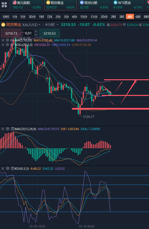 多空的快速转换,总是让人措手不及,方向的转换往往只在那一瞬之间,多少人冒着风险成为了市场的炮灰。每一笔交易都是心中多空抗衡后的结果,入场前对于市场而言,多空似乎都有理有据,只是每个人看待问题的角度不同而已,而决定自己入场方向的理由需要首先说服自己,同时入场前首要考虑的应该是自己能够承受的风险而非利润,关键点位一旦失守需要果断离场斩断亏损的魄力!能接受亏损才能享受利润!这条路上心态很重要,失败并不可怕,可怕的是你不愿意总结,如果你始终是一成不变,那你才是真正的失败! ————————消息面 周二(5月20日)现货黄金则小幅走弱,目前交投于3210美元/盎司附近,跌幅约0.6%,市场憧憬特朗普和