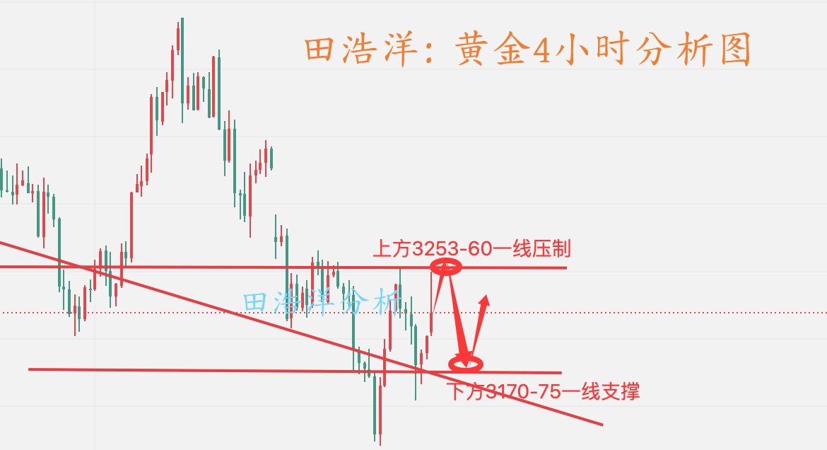 今天周一黄金可以说比较调皮,早间开盘上冲,最高触及3250一线再回踩最低3206一线,早间市场上很多人在3240-45一线高位追多,相信结局也是比较遗憾,关注我的朋友都知道,我上方3240-53都是给做空思路,高位不要追多,毕竟3253-60一线重要压制没有突破,下午我们在3230一线做空,然后在3247附近补仓做空,已经在3234一线全部获利出局落袋为安,跟上操作的朋友晚餐可以加上鸡腿了,做一个稳健的交易者,本人田浩洋一直在这里,如果你目前黄金操作不理想,希望田浩洋能让你的投资少走弯路,欢迎前来沟通交流! 从4小时线分析来看,下方支撑继续关注3170-75附近,强支撑3150关口,上方压力