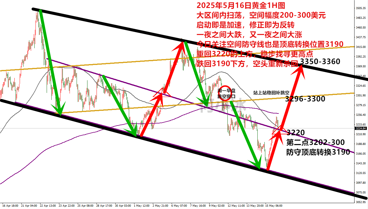 张津镭:黄金先涨后跌,多头小心被"截胡"! 昨日黄金走了一个探底回升行情,亚盘开盘开始回落,午盘刷新近期低点至3120一线,空单亦是赚了不少。不过后续开始震荡反弹,晚间收回失地并再度回归至3200上方。最终金价是收盘于3239美元,日线收于一根大阳线。 周五(5月16日)昨日黄金大涨一方面是俄乌和谈推迟至周五,双方领导人均不再出席,市场打消了俄乌双方快速达成和平协议的预期,避险资金和逢低买盘快速回归黄金市场。另一方面,美国经济数据表现较差,美联储降息预期升温,美债收益率大幅下跌,美元指数也承压下行,给金价提供上涨动能。 另外,特朗普访问中东,可能引发新的紧张局势,若冲突升级,黄金避险买盘将增