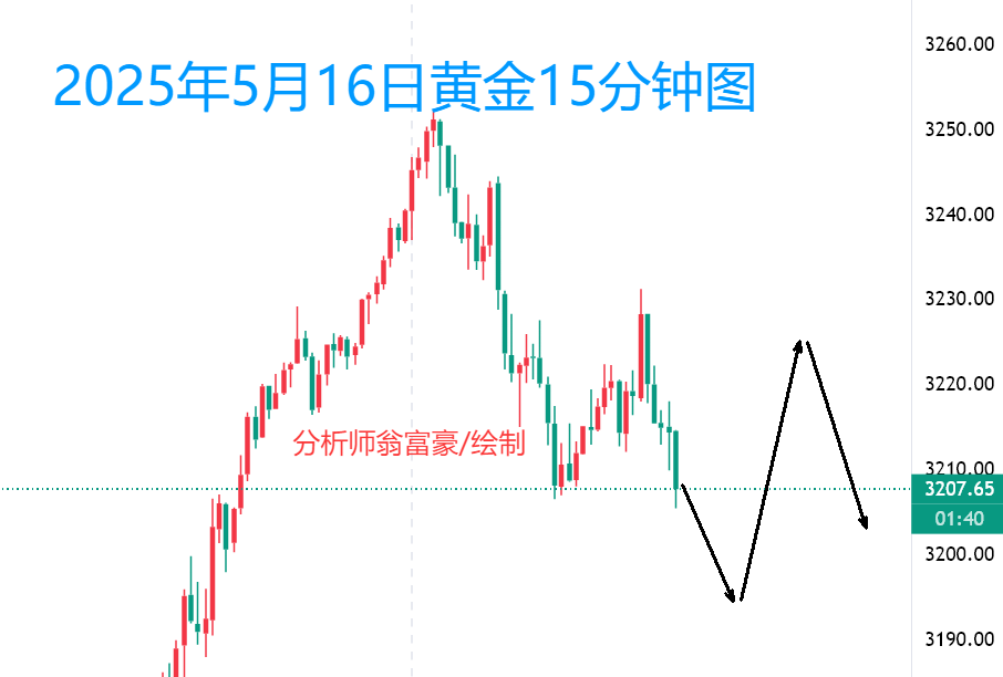 高晓峰:5.16黄金暴风雨前的宁静:周五收官谨防过山车行情 黄金市场昨日呈现探底回升的V型反转形态,日线收出带极长下影线的锤头阳线,表明下方支撑强劲,但整体仍维持高位震荡格局。技术指标显示短期回调压力犹存:随机指标高位钝化,MACD双线死叉向下,布林带开口向下,金价大概率围绕中轨与下轨区间波动。 4小时级别震荡偏空,3200一线成为多空分水岭,若有效跌破此位,空头将重掌主动权;反之,多头需突破3265-3270强阻力区方能扭转颓势。周线收官之际,市场存在修复性下跌需求,若跌破3200整数关口,下方目标看向3180-3170区域。重点关注3265-3270阻力有效性及3200支撑强度,警惕周五