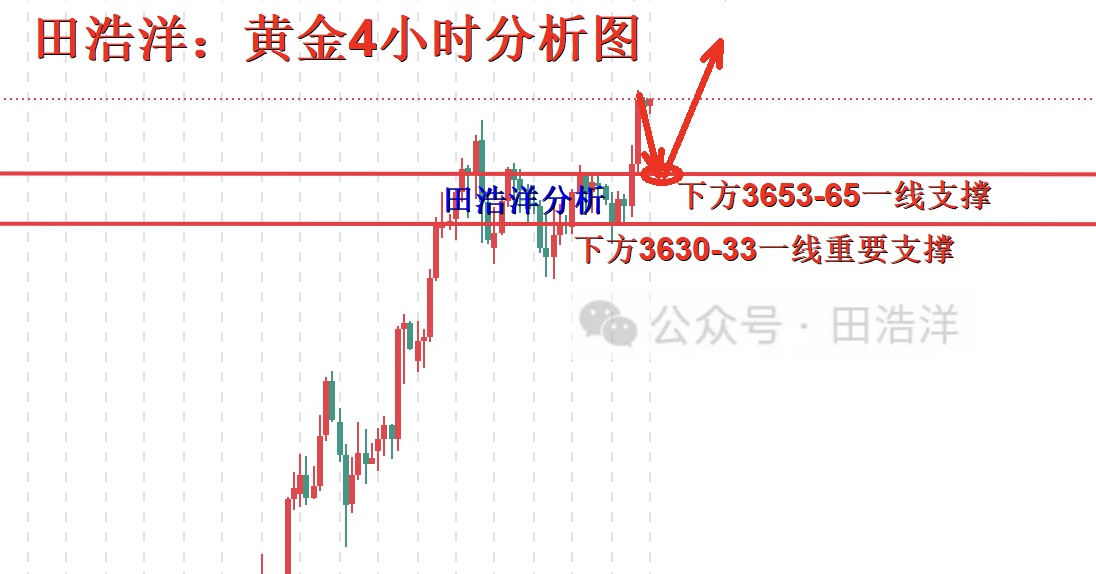 黄金多头如期崛起,再次创下历史新高3685一线,多头依旧是近期主要趋势,上方依旧还有新高,所以我们耐心等待黄金继续崛起,回踩我们继续找准机会进场做多,昨天我们早间就给了3627-29一线做多的进场,完美到达我们的目标,今天我们继续等待回落再多,毕竟所有指标都是看涨,多头强势不要猜顶,如果周四凌晨美联储利率决议助力多头,那么3700一线也是唾手可得,目前3680一线上方大家不要盲目追多和追空。如果你目前操作不理想,希望田浩洋能让你的投资少走弯路,欢迎前来沟通交流! 从4小时分析来看,下方支撑关注3655-65一线附近,日内回踩依托此位置继续主多顺势看涨不变,短期多头强势分界线3630-33一线