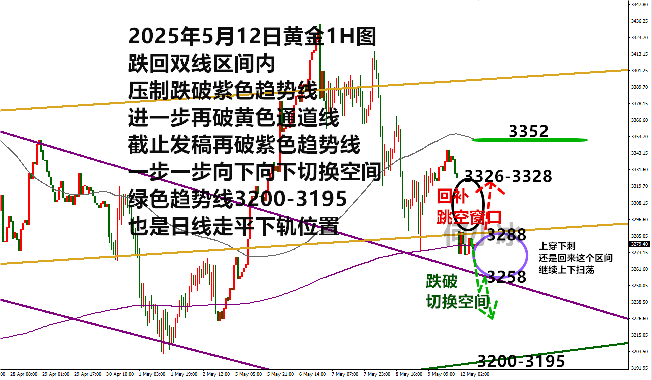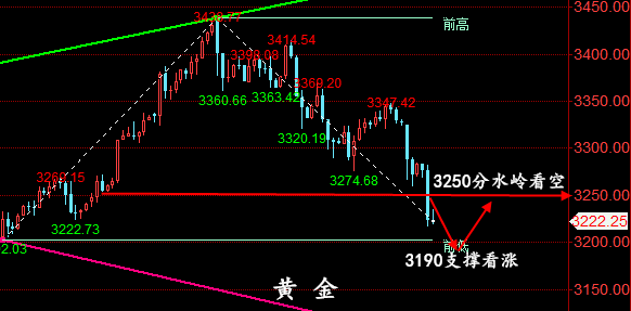 何小冰:关税牵动金价涨跌,3258是空间分界点 今日周一,早盘跳空窗口的信号,挖了多少个坑,大家都以为需要回补跳空窗口,但价格迟迟就是不回补 反复测试3280上下位置,在15点后借助消息利空以及机构批量空单进场,价格短线急跌超60美元,加速下跌至3219区域 我们从早盘一直围绕3280进行高空,连续三次高空,都如愿承压下跌,最后一次在加速下跌中收获! 跳空窗口,亚欧盘没有回补,后面就先铭记在心,总会回补的,只是时间的问题,后期价格重新回到通道区间和双线区间内,再去考虑回补的问题 现在重点是: 需要把注意力,放在黄色通道线、紫色通道线以及小时图双线,配合日线收口的形态区间 具体展开来说说: 1