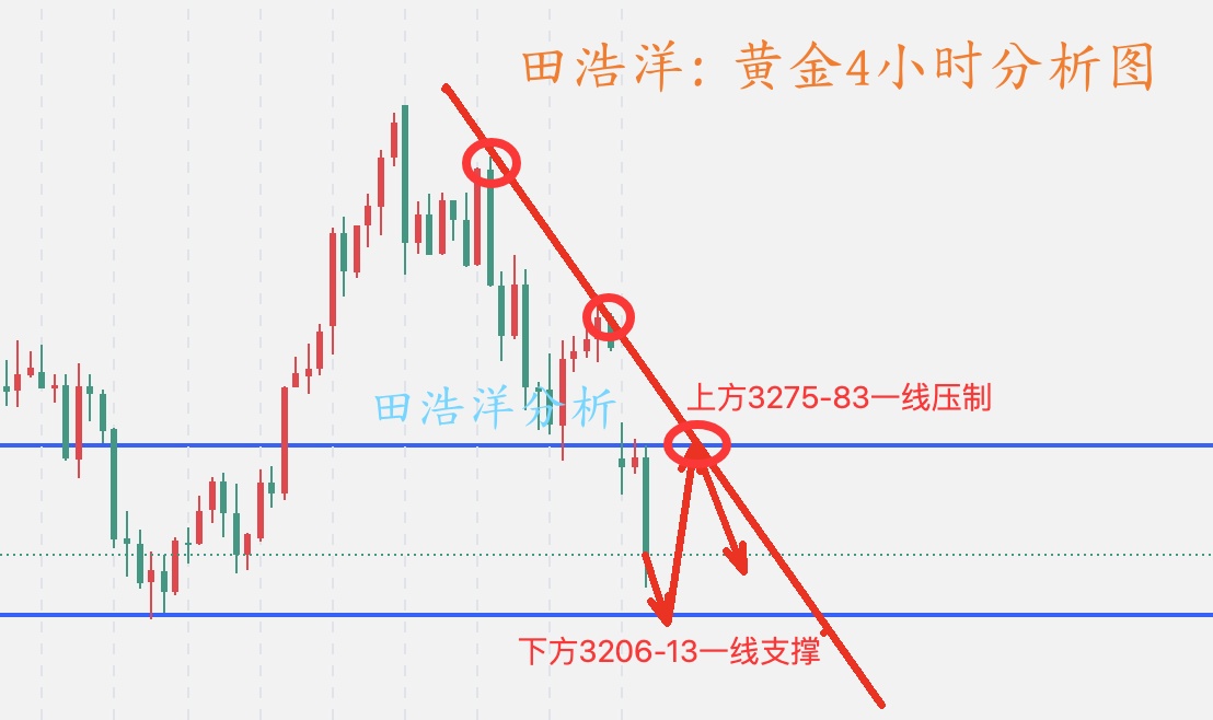 黄金自从开盘跳空低开3275一线后,反弹最高3292一线后开启回落节奏,截止目前黄金最低触及3216一线后震荡上行,多头暂时被强力压制,我们依旧以反弹做空为主,毕竟大趋势看空为主,上方32775-3281一线是目前的主要短期压制位,反弹不破可以继续空,空头继续可能出现新低,关注3200关口支撑情况,做一个稳健的交易者,本人田浩洋一直在这里,如果你目前黄金操作不理想,希望田浩洋能让你的投资少走弯路,欢迎前来沟通交流! 从目前黄金走势来看,下方关注3206-3215一线支撑,上方阻力关注3275-81一线短期压制,强阻压制3290-3300关口附近,此位置也是多空强弱分水岭,日线级别未突破并站上