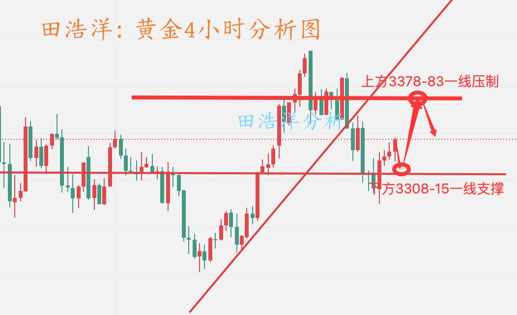 黄金今天进行了一波触底反弹,最低触及3275一线反弹,我们白天没来及给出3280一线做多,所以错过的行情我们就等待,晚间我们直接3340一线空,空单完美在3325一线获利出局,目前黄金继续开启反弹,上方我们关注3360-68一线重要压制,今天周五我们关注上方3360-68一线关键压制位,反弹不破可以空。做一个稳健的交易者,本人田浩洋一直在这里,如果你目前黄金操作不理想,希望田浩洋能让你的投资少走弯路,欢迎前来沟通交流! 从4小时分析来看,下方支撑关注3308-15附近,上方关注3378-85一线短期压制,日线级别保持高空低多节奏,具体操作策略我会在盘中提示,及时关注。 黄金操作策略: 1、黄