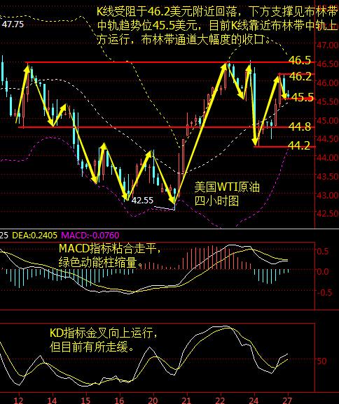 行情回顾 原油昨日收取一根带上影线的阳柱,OPEC助阵油价多头重回市场!受到消息面的刺激,油价昨日突破了45.5美元的压力位,上方最高涨至46.2美元!到达高位后,油价高位盘整,凌晨时段又出现暴跌!早间开盘后,延续了凌晨的跌势,继续下探。 白银方面,昨日收取一根阴柱,银价在触及20美元阻力位后,仍旧是没有有效突破2