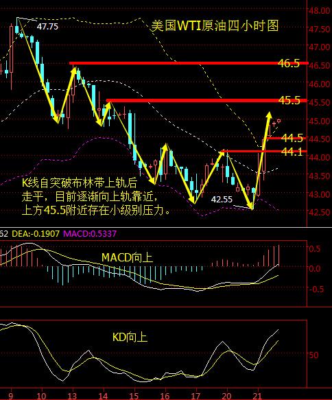 文/袁慕辰 摘要美国WTI原油从四小时走势图来看,K线自突破布林带上轨后基本走平,目前逐渐向上轨靠近,上方45.5附近存在小级别压力。 国际消息面分析: 库存方面,日内凌晨美国石油协会(API))最新公布的数据显示,美国9月16日当周API原油库存意外大减749.7万桶,预期为增加225万桶;API汽油库存大减245.3万桶,预期为减少