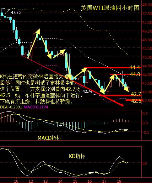 文/袁慕辰 摘要美国WTI原油从四小时走势图来看,K线在短暂的突破44后直线回落,同时也是测试了布林带中轨这个位置,下方支撑分别看向42.7及42.5一线,只要这两个位置不破,短期内还是有上涨的可能。 基本面分析: 美国WTI原油10月期货周一(9月19日)收涨0.27美元,或0.63%,盘中最高触及44.69美元/桶,报43.30美元/桶。布伦