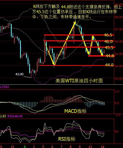 文/袁慕辰 摘要美国WTI原油从四小时走势图来看,K线在下方触及44.8附近这个支撑录得反弹,但上方45.5这个位置仍承压,目前K线运行在布林带中、下轨之间,布林带通道走平。 基本面分析: 美国WTI原油10月期货周二(9月13日)收跌1.39美元,或3%,报44.90美元/桶,盘中最低触及44.77美元/桶。布伦特原油11月期货周二收跌1.22美