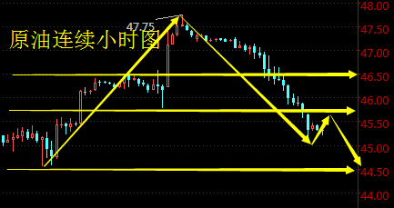 【策略分析】 纽约原油(USCRUDE):上周五WTI原油期货价格收盘下跌1.74美元/桶,跌幅3.7%,收报45.88美元/桶,虽然周五油价创一个月最大单日跌幅,且抹掉上一交易日因美国原油库存意外暴减所录得的大部分涨幅,但是周内美国WTI原油期货价格整体仍然上涨3.2%。技术图表显示,油价隔日单边下跌,日线报收略带上下影线的大阴
