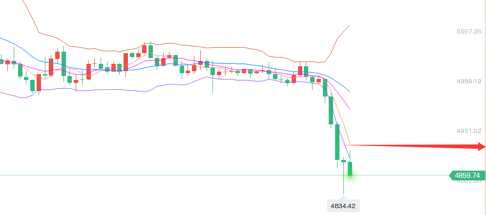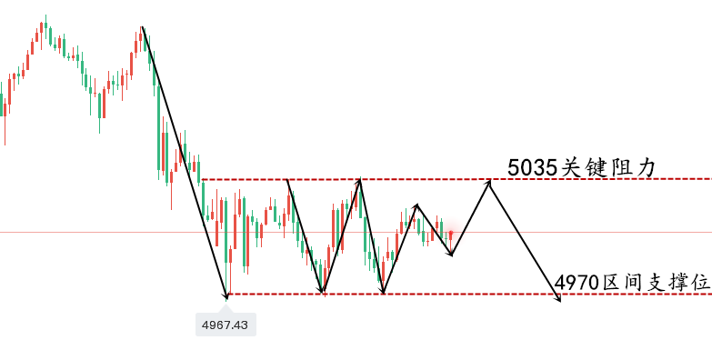 今天原本预计在美联储决议前区间震荡等待午夜老包讲话来刺激引导,但欧盘出现大幅跳水,就说明消息泄露,提前走了预期,后半夜讲话可能就是偏鹰派的,那么等到真正落地之后,就可能反而出现利空出尽,“卖事实”的探底拉升,一旦老包讲话中,能稍微出现温和稍鸽的言论,就容易出现快速的回抽;而关键位置今晚首要留意4840-4833,一个是2月中旬的起涨点,一个是66日均线,看能否形成双底;去年1月份开始至今,经历过两次收敛三角修正,一次是3500,盘整了四个月,一次是4381,盘整了两个月,都有效守住了此66日均线,所以这次能否再稳住是比较重要的,当然存在惯性作用,可能会出现击穿假象,或先大阴失守,随后几日就马