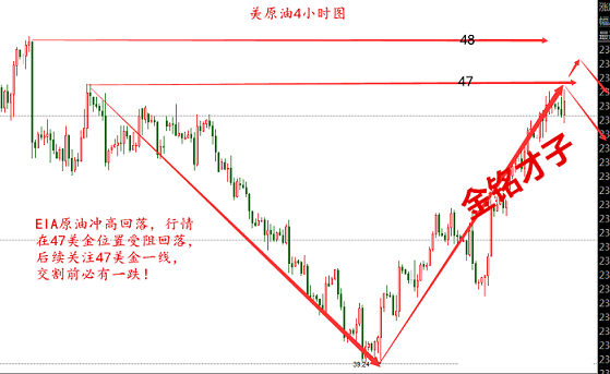 投资如同下棋,当局者迷,旁观者清,下单如下棋,当局者迷旁观者清。盘面如人生,放下应该放下的,那么就能得到你所想得到的。不要再为了几个点的波动就惊慌失措,因为我们做的是最有把握的单。 晚间EIA行情可以说是惊险刺激,美盘开盘时段攀升至46.58之后行情一路震荡下行,直到数据公布,EIA数据公布利多时录得45.84美元