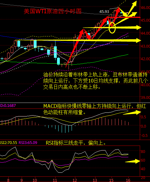 昨日原油最高到46.59美元/桶,且行情将会回调休息继续上行,今日建议大家继续低多为主,行情在今天看来已经站稳了所谓的45 美元/桶,目前价格在46.3 美元/桶,激进者大家可以现在继续看多的,因为目前俄罗斯可能继续采取冻产这一程序,所以从这个以点上无疑是给了看多的投资者一点利多的信心,加至布伦特原油期货和美元原油
