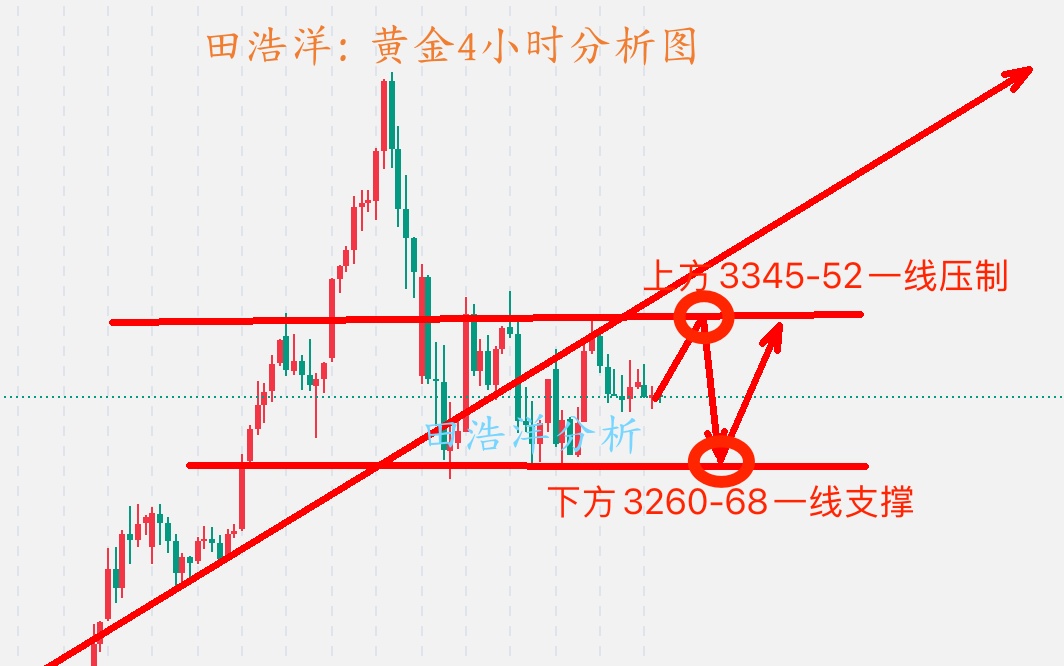 黄金本周经历了多次反弹都没有突破上方压制,周末我们也是给了确切的思路——反弹做空,关注我的朋友和实盘这两天都是获利的,本人田浩洋一贯坚持稳健操作为主,顺势而为,不频繁操作,这样才能在各种行情中稳中求胜,日内黄金依旧震荡等待机会进场,上方继续关注3328-35一线短期压制,重点关注3345-56一线压制情况,技术面依旧是反弹做空为主,如果你目前黄金操作不理想,希望田浩洋能让你的投资少走弯路,欢迎前来沟通交流! 从4小时分析来看,上方继续关注3328-35一线短期压制,重点关注3345-56一线压制情况,日内反抽依托此位置继续先空下看延续回落,下方支撑3290-85附近,短线多空强弱分水岭326
