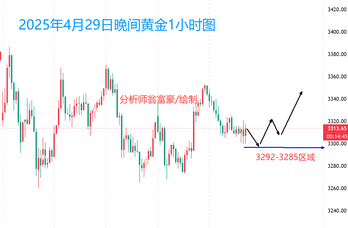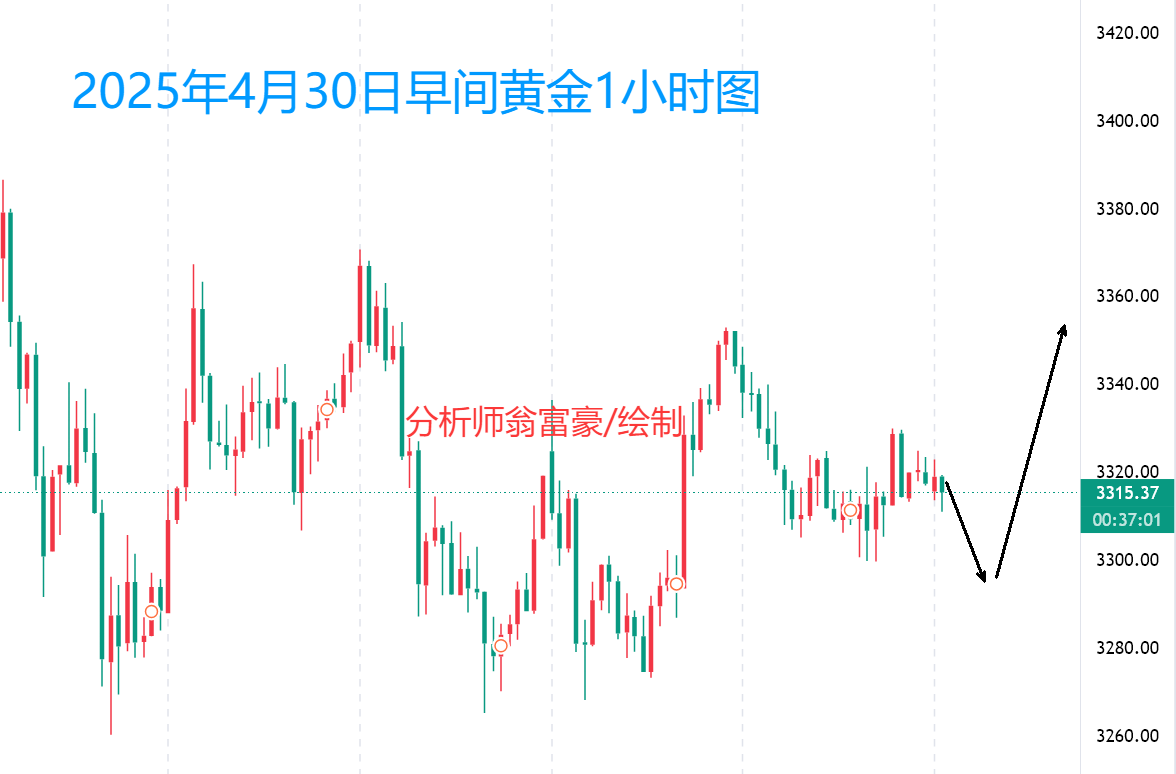 2025年4月30日星期三 黄金震荡延续 黄金于高位进行震荡整理,继续关注震荡边缘位置表现! 基本面因素影响,大级别空头仍存在诸多关键支撑,技术面,横盘整理,下方支撑位置明显,注意本周关键重要数据表现。 4小时,震荡收缩,大区间3260-3370震荡区间,注意区间中的小区间级别震荡边缘表现,形态确认,日间操作也就变得简单。日内操作注意离场要坚决,莫贪。 小区间位置看1小时级别 3300-3330区间小级别震荡边缘。 今日综合:大周期继续震荡整理,耐心等待布局机会。日内作业围绕大震荡区间结合小震荡区间表现做作业。 特别提醒:无论行情是否按我们的预期走,都应根据资金合理安排仓位,做好止损的执行。