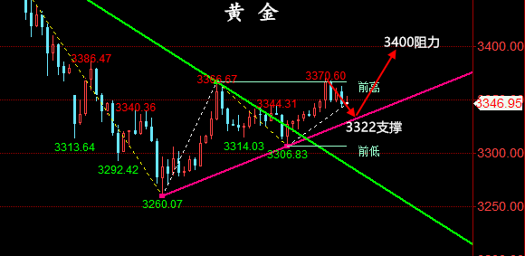 如盈财女:4.25黄金原油反弹继续做空 黄金方面,还是持续受到关税政策的刺激影响加上美联储目前保守的态度,让市场变的更加扑朔迷离,美方称已跟中国展开商谈,关税可能有缓和的情况,但是昨天我国外交部称目前并未有任何沟通,这让市场避险情绪再度回升,黄金连续两天探底之后在半夜回升,上个交易日早盘反抽到3367一线之后震荡回落,欧美盘加速下行,最低触及3306附近没有二次破3300关口在晚间尾盘再度走出强势拉高,早盘一度触及3370一线,日线三连阴之后收阳。 黄金早盘冲高回落,黄金现在开始震荡了,至于黄金是否发生反转,目前来看并没有,还仅仅只是震荡而已,黄金1小时均线还是死叉空头排列的形态,而且黄金冲