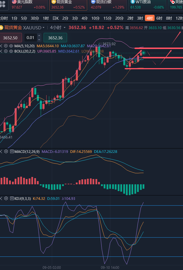 对于最近行情涨涨跌跌,反反复复,多空转换频繁,很多投资朋友们都措手不及,或不知从何下手,一买进就跌,出场就涨,来来回回连续损单,其实这是很多新手朋友们都会出现的情况,在这里告诉大家,做交易首先不要频繁去操作,其次要对行情需要有一个精准的把控,坚持自己的交易系统,当然这些对一些新手朋友来说都是空谈,毕竟才入市并没有严格的交易计划,大多数都是追涨杀跌从而导致严重亏损,如果此时此刻看到文章的你也是这样的情况,那么可以咨询本人沟通交流一下,可以帮你指出做单中所有的问题,这样可以让你在交易的过程中少走歪路! 消息面: 周五(9月12日)欧市早盘,现货黄金维持震荡上行走势,目前交投于3650.18美元/