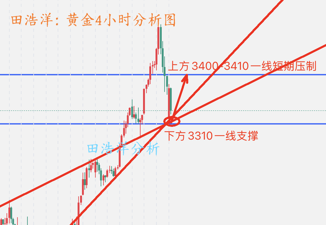 黄金近期涨跌无常,而且幅度非常大,昨天最高3500一线触及后开始回落,今天凌晨最低3372一线,今早开盘直接最低到了3315一线,然后又开始大幅拉升,最高到了3386一线,目前继续在这个区间内来回上下波动,昨晚我们3370-73一线做多后,在目标3400-3410一线找机会获利出局,这样的涨跌无常而且幅度之大的情况下,我们以稳健操作为主,看不懂的我们宁可观望等待,如果你目前黄金操作不理想,希望田浩洋能让你的投资少走弯路,欢迎前来沟通交流! 从4小时分析来看,下方支撑关注3310-3315一线附近,关注3400-3410一线短期压制,大涨大跌的行情谨慎追单,更不要重仓操作,耐心等待调整充分后进