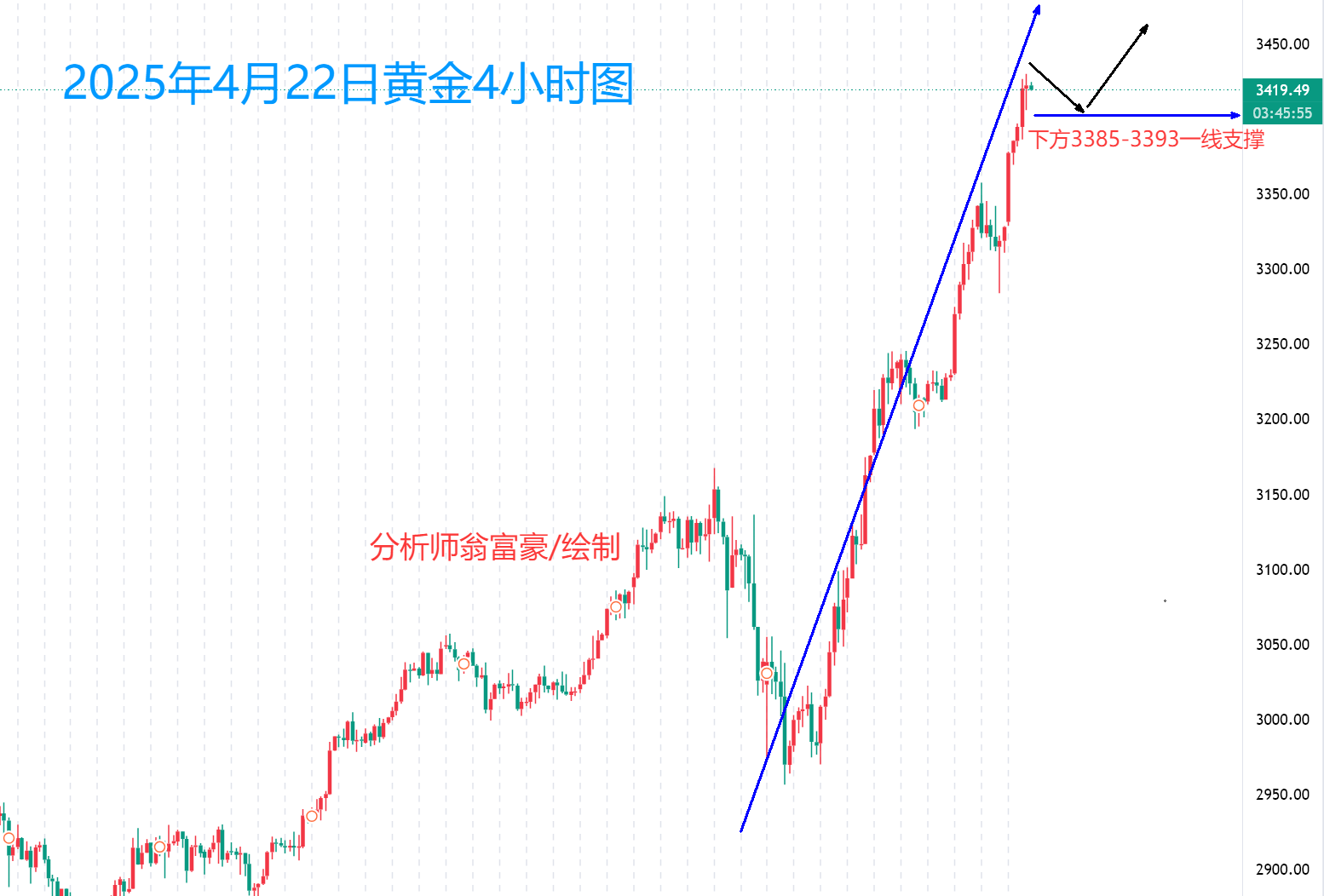 高晓峰:4.22黄金再次突破新高,接下来怎么走? 目前黄金价格在日线级别延续高位震荡偏强态势,技术面信号逐渐弱化,多空博弈陷入胶着。由于杠杆属性带来的波动放大效应单日波幅常达几十个点甚至达到一百以上,短期操作需强化风险意识。 4小时级别:黄金多次演绎“拉升-回调-再突破”的循环模式,近期震荡区间上沿逐步抬高。需警惕回调至均线支撑带后的二次冲高机会。 黄金建议:回踩3425-3430附近做多 止损3418 目标3465 或者反弹到3460-3465附近做空 止损3472 目标3430 文/高晓峰专业国际市场点评 ,本人解读世界经济要闻,剖析全球投资大趋势,对原油、黄金、白银等大宗商品等有深入