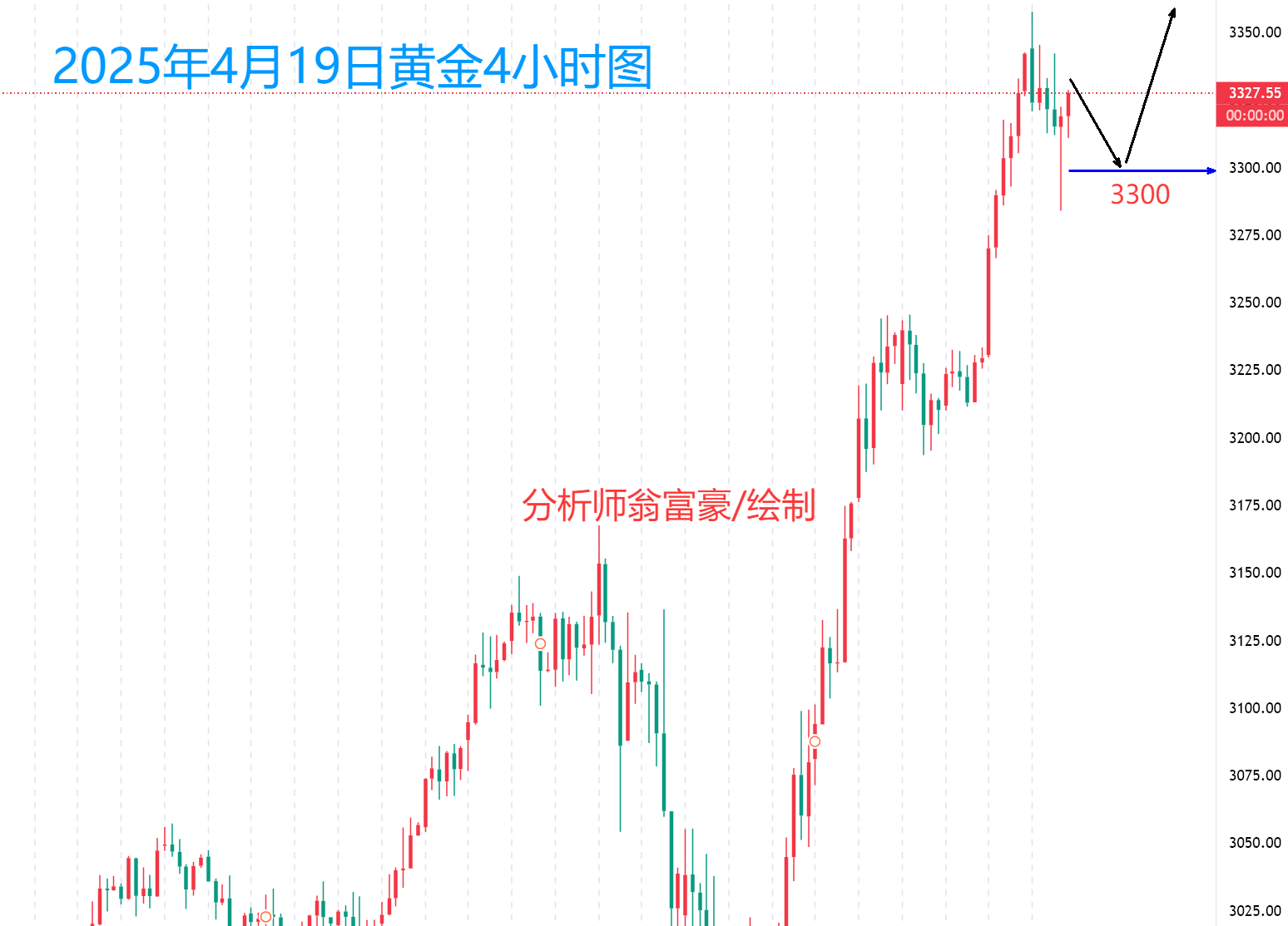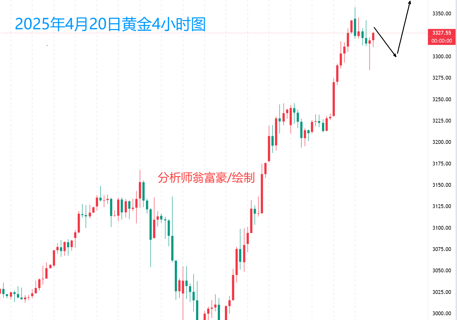 受海外耶稣受难日假期安排影响,黄金与外汇市场今日全天休市停盘。昨夜黄金价格出现技术性回调,最低下探至 3283 美元/盎司。因今日休市部分多头资金选择获利离场,不过黄金整体多头趋势结构未发生根本改变,价格回撤幅度和市场情绪波动均有限。晚间黄金价格在技术性支撑位获买盘支撑,重新企稳于 3327 美元/盎司附近,显示多头力量仍主导市场。 在昨日技术分析中,本人翁富豪已明确,黄金市场当前处于震荡偏空回踩的技术形态,但因多头趋势支撑较强,不建议大家盲目做空。鉴于今日市场休市,翁富豪建议大家合理调整交易节奏,优化持仓结构,为下周市场重启做好准备。 对于后市黄金价格走势,本人翁富豪维持看涨观点。从短期因