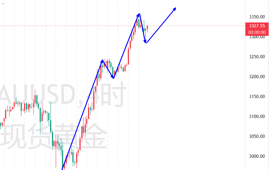 黄金多头趋势下周能否延续?还有没有新高的可能? 黄金本周多空轮番上阵,周三强势上升不带回调的大涨,从早涨到晚凌晨还能继续上升破高,历史少见!周四冲高回落转跌,从最高点3357到3284,跌幅也有73美金,涨的快跌的也快,这就是现在的行情,直上直下没有技术可言。 黄金这一轮涨跌是关税政策主导,周三不靠谱把关税提高到245%,同时美联储也拒绝降息救市,股、债、汇市三杀引起市场恐慌,避险升温直接导致黄金暴涨。而周四的下跌,一方面是复活节假期因素;另一方面也有多头获利了结的原因。另外,关税战走到这个地步基本已经到顶了,周末这几天不就有缓和的消息逐步放出吗,这个我们下面再说。 周四早间冲高回落打破了这