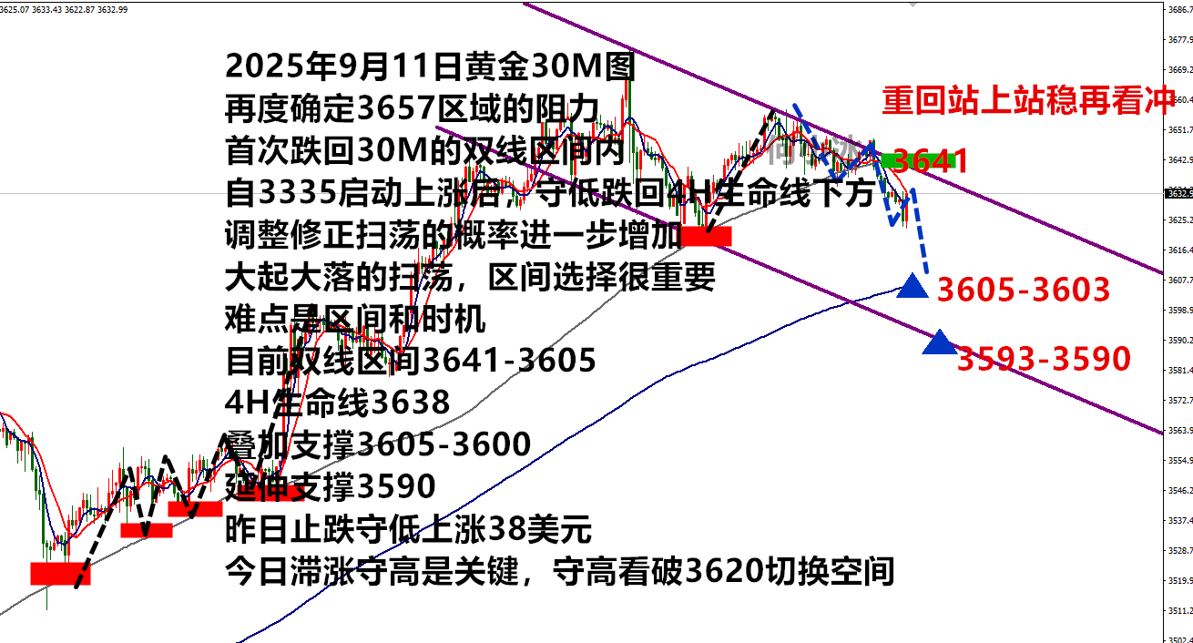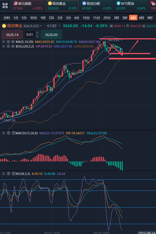 短线做波动,中线做波段,长线做趋势。投资的两端分别是分析和交易,而连接这两端的是等待,等待的核心是谨守能力圈和尊重常识,耐心等待最好的机会出手,避免频繁交易是公认的致胜法宝之一。 ————————消息面 今日周四(9月11日)黄金小幅回落,未能延续前一日涨势,目前交投于3626附近。受股市创新高和美元小幅走强影响,部分投资者选择获利了结。然而,美联储降息预期及地缘政治紧张局势仍对金价形成支撑。市场正聚焦即将公布的美国CPI数据,该数据或决定黄金能否突破3675美元的历史高位。 原油小幅回落,目前交投于63美元/桶附近。地缘政治紧张局势加剧,地区风险溢价上升,同时美国推动对俄石油买家进行新的施