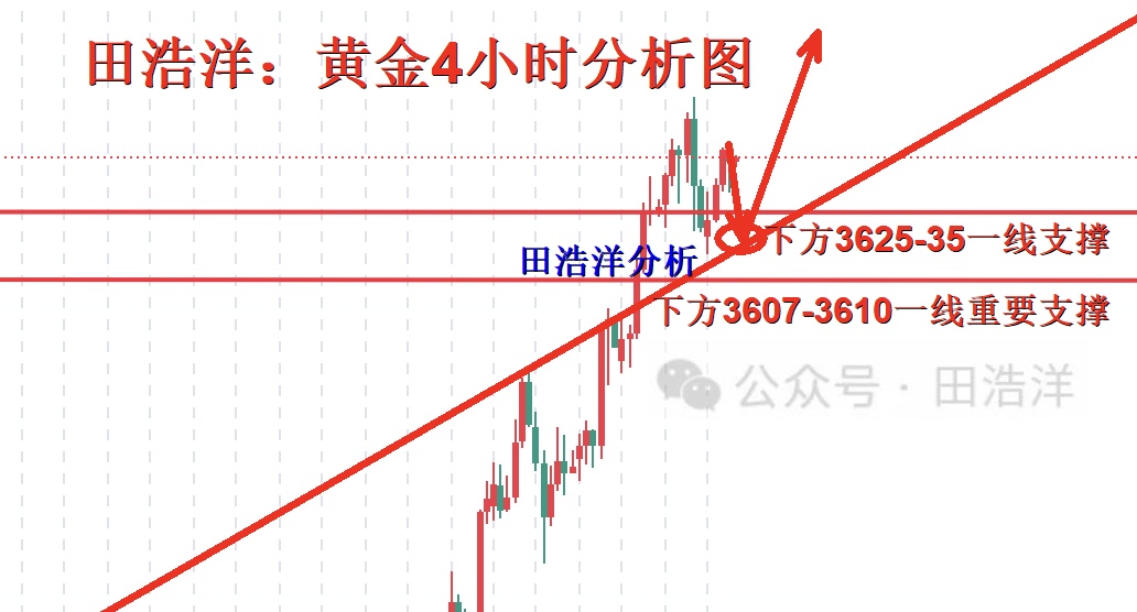 黄金今天周五开盘比较平淡,开盘3633一线,目前依旧在此位置震荡,从小时均线老看虽然有走弱拐头的迹象,但最终还是每次探底之后都能快速上涨,重新让黄金回到高位,现在整体还是蓄势震荡,在本人田浩洋看来,只要不破3600一线的关键支撑,黄金反弹也是顺其自然,既然每次调整都没有出现滑铁卢一样的情况,那么黄金多头的趋势就依旧还在,现在还是蓄势上涨的阶段,操作上我们继续以回踩做多为主。如果你目前操作不理想,希望田浩洋能让你的投资少走弯路,欢迎前来沟通交流! 从4小时分析来看,今日下方支撑关注3610-15附近,日内回踩依托此位置继续主多顺势看涨不变,短期多头强势分界线依旧关注3600整数关口,日线级别企