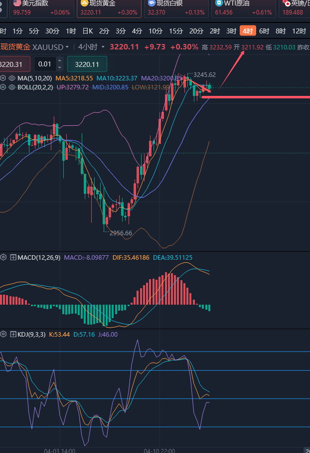 市场就是这样,有赚就会有亏的,因为每个人的看法不一样。对于市场突变的行情是我们管不了的,就像在生活中,有一些事是无法避免的,总是身不由己。对于这些我们能够做的只有顺从,对于突变的行情是我们无法预知的,我们能做的就是做单上需要严格进行止损,保持平常心去对待,不要恶意的去扛单,摆脱侥幸的心理。 ————————消息面 周二(4月15日)现货黄金窄幅震荡,目前交投于3220美元/盎司附近。金价周一冲高回落,在盘中稍早刷新历史高点至3245.51后回落,因白宫豁免多数国家电子产品高额关税后,风险情绪有所改善。 原油价格目前交投于61.5美元/桶附近。数据显示,亚洲大国3月原油进口量大幅反弹,但由于经